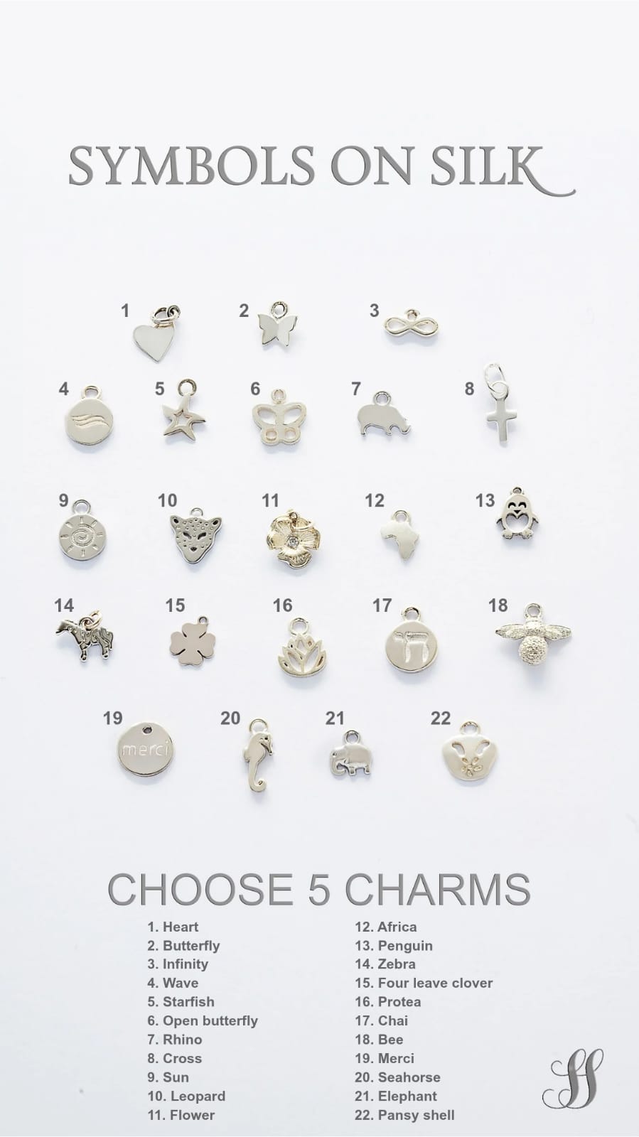 Please email admin@symbolsonsilk.co.za to specify the 5 charms you would like from the list available.